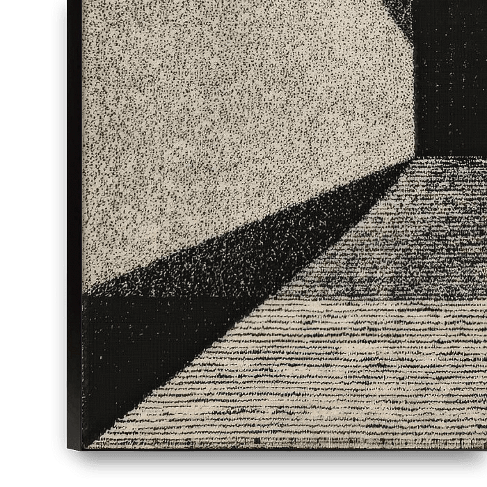 This monochrome composition is based on a precise arrangement of basic geometric shapes. A central black square forms the anchor point, surrounded by a diagonal grey parallelogram and a corresponding triangle. The right side of the image is defined by a grid of fine vertical lines and layered horizontal structures in various shades of…