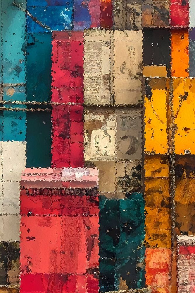 Geometric blocks piled up, with many different colours, yellow pink, blue, lilac, ochre, orange beige and black.