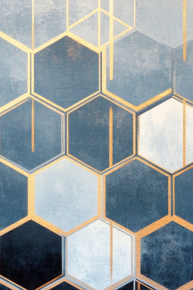 A harmonious mosaic of hexagons unfolds in a fascinating interplay of shapes and colours. Golden accents run through cooler shades of blue, while brilliant white and deep black provide dramatic contrasts. This composition evokes associations with artistic structures and dynamic movements that cast a spell over the viewer.