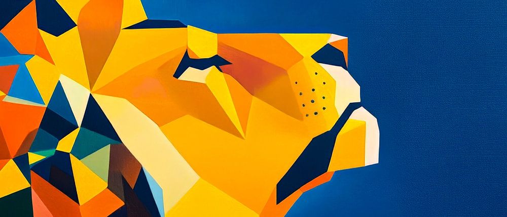 A majestic lion, skilfully depicted in bright yellow tones and geometric shapes, radiates strength and determination. The deep blue background intensifies the energetic aura of this imposing creature. Ideal for the living room, it creates an inspiring centrepiece and attracts everyone's attention.