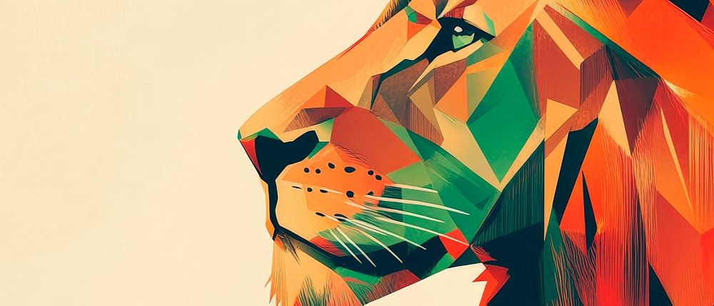 A majestic lion in bright, geometric shapes radiates strength and grace. The warm, earthy colours give the room an inviting atmosphere and make it a perfect piece of art for the living room, where it can stimulate conversation and attract admiring glances.