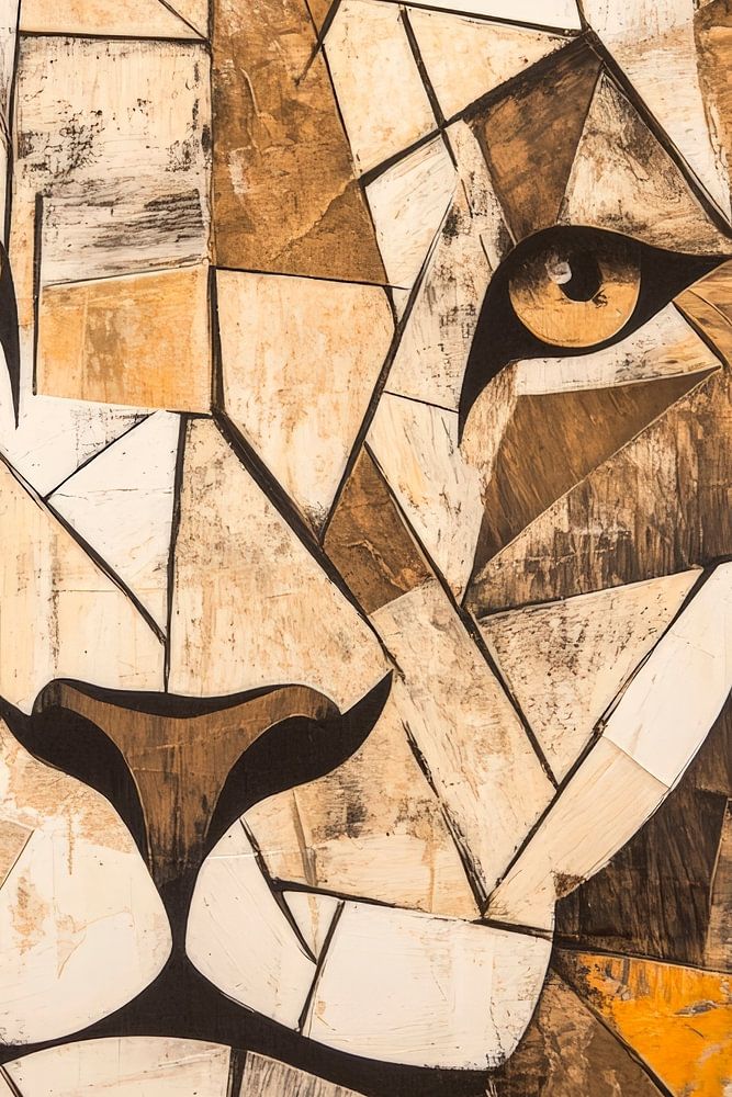 An imposing lion stands out with its powerful eyes and dynamic design language. The harmonious earth tones combined with vibrant yellow lend the artwork a lively presence. Ideal for the living room, where it radiates strength and elegance while stimulating exciting conversation.