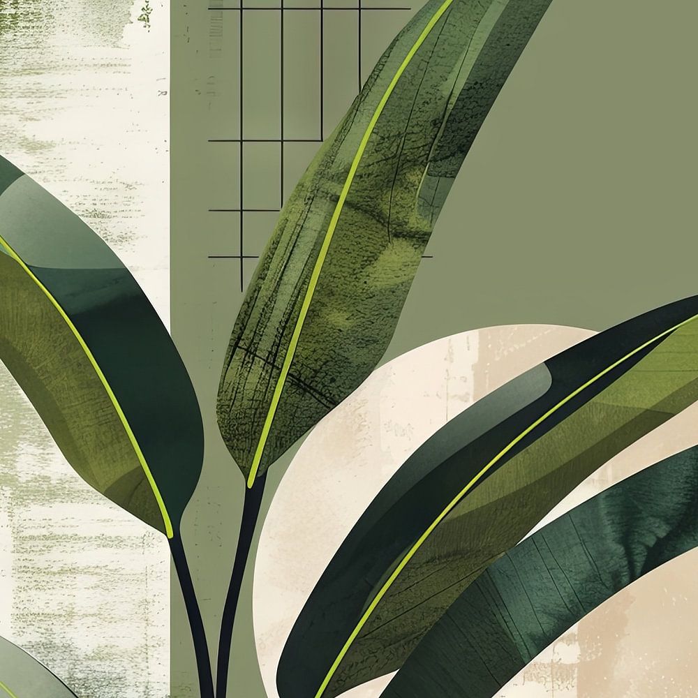 This fascinating plant composition combines the clarity of geometric shapes with the lush vibrancy of tropical leaves. The lush green leaves contrast harmoniously with the subtle beige and olive-coloured circles and lines in the background, giving the painting a subtle yet powerful dynamic. Ideal for lovers of abstract art and nature motifs, this work brings a fresh, calming atmosphere to any room. A real eye-catcher that interprets the natural beauty of tropical plants in a modern way.