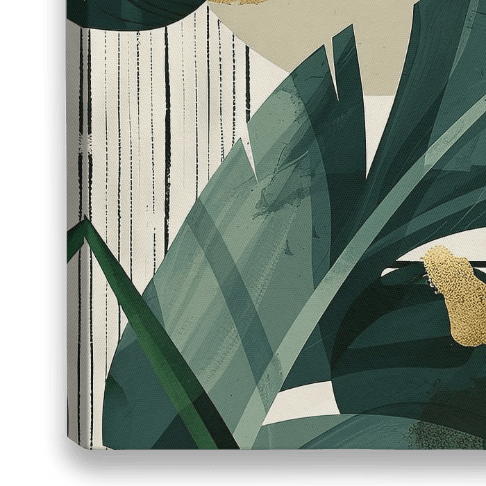 This fascinating plant composition combines the clarity of geometric shapes with the lush vibrancy of tropical leaves. The lush green leaves contrast harmoniously with the subtle beige and olive-coloured circles and lines in the background, giving the painting a subtle yet powerful dynamic. Ideal for lovers of abstract art and nature…