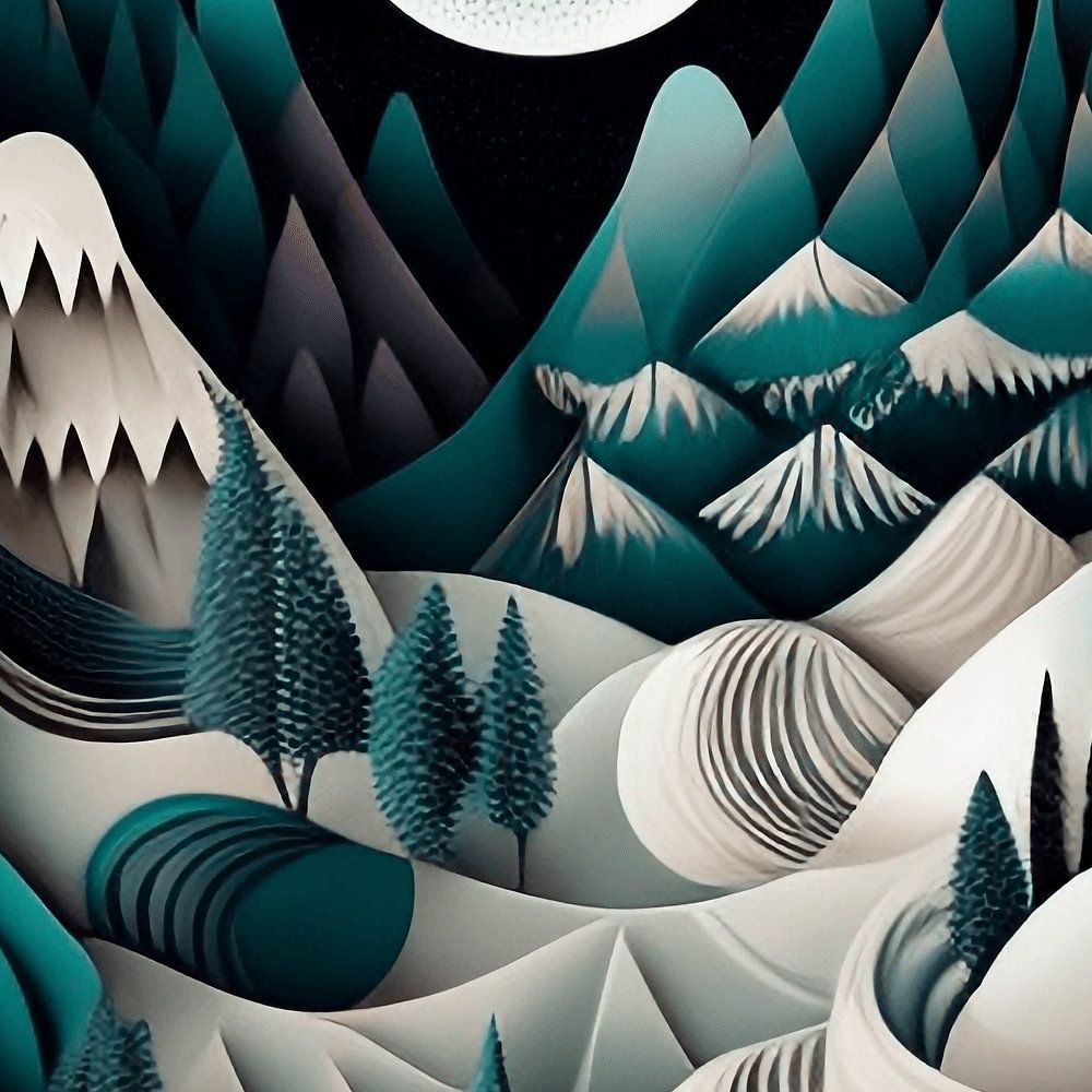 A surreal winter landscape with abstract mountains, trees and valleys in shades of turquoise, white and grey. The jagged, icy peaks rise dramatically, with layered textures reminiscent of intricate, geometric carvings. Small, tapered trees line the snowy slopes, creating a dense, enchanted forest feel. A large, textured moon hangs above, casting an ethereal glow over the land. The foreground has rounded, detailed shapes reminiscent of planetary surfaces, lending the scene a cosmic, otherworldly dimension. The overall atmosphere is mystical, blending cold serenity with dreamlike elements in a harmonious colour palette.