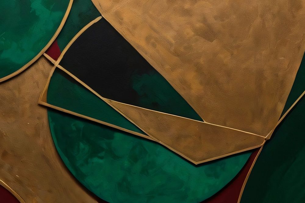 This design exudes modern elegance through the combination of rich colours such as gold, green and red. The circular shapes and geometric patterns create a harmonious and dynamic whole that fits perfectly into contemporary interiors. The combination of these powerful shapes and colours gives any room a sophisticated and modern look. The design can function perfectly as a statement piece in a living room or office, where it adds both tranquillity and sophistication. With its powerful contrasts and balanced use of colour, the design attracts immediate attention without dominating the space. The artwork offers a stylish and timeless addition to modern interiors.