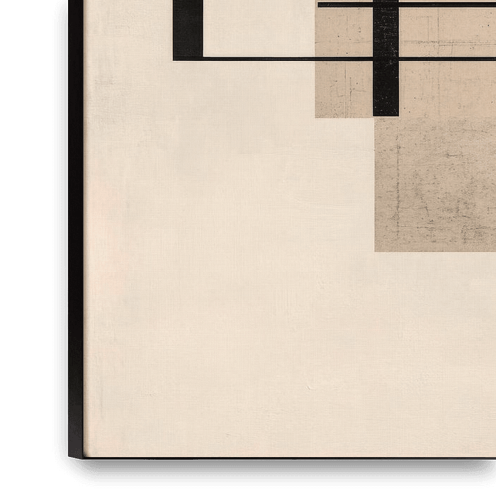 Geometric harmonies dance on a soft surface, while a bold black circle draws the eye. Rectangular fields and sharp lines create an exciting interplay of light and shadow. The reduced colour palette of black and beige lends the work a timeless elegance that inspires reflection and sharpens the senses.