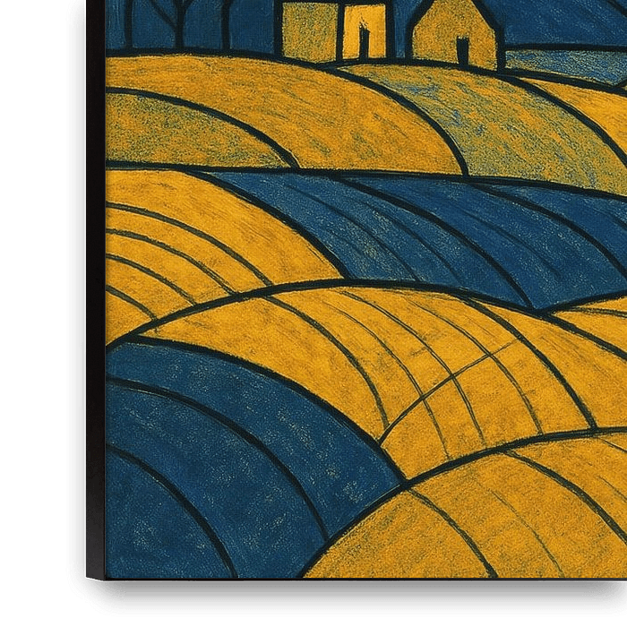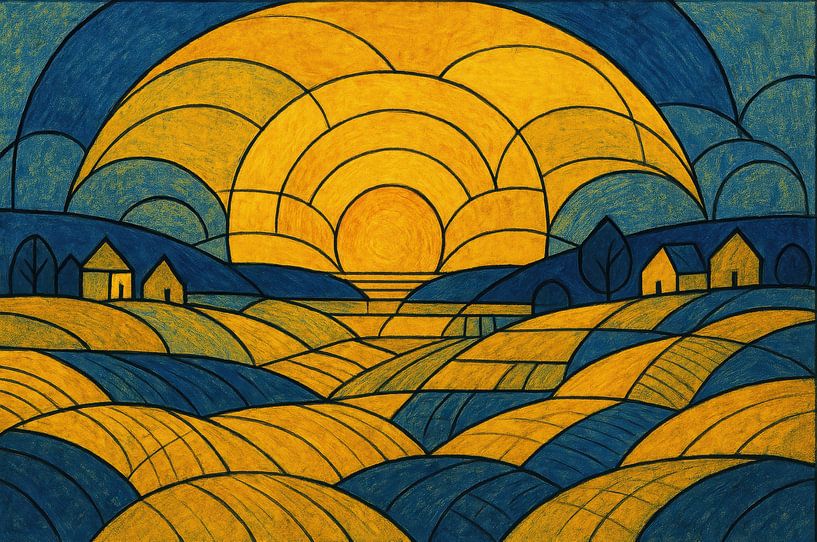 Layered, arching lines form a rising sun over undulating, blue fields. Small houses are scattered on the horizon, while the strong contrast between warm yellow and cool blue gives depth and rhythm. The interplay of lines divides the landscape into harmonious planes and allows the eye to meander through hills and sky. The atmosphere is…