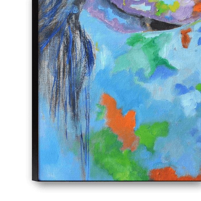 This captivating work is a portrait distinguished by its vibrant and bold colour palette. The woman's face, partially turned back, immediately draws the eye with its enigmatic expression and piercing gaze. The artist's technique employs a blend of blue, green, orange, and yellow brushstrokes that harmonize beautifully on the skin and hair, creating a dynamic texture. The blurred background, composed of pastel shades, highlights the main subject while adding subtle depth to the composition. The combination of intense and contrasting colours suggests a unique interplay of light, lending the painting impressive energy and dynamism. This portrait does more than simply depict a face; it evokes a multitude of emotions and possible stories, inviting the viewer to delve into the world imagined by the artist.