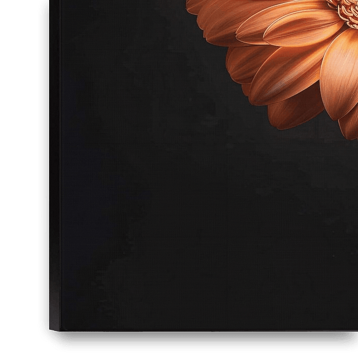 This artwork shows an impressive gerbera against a dark background. The contrast between the vibrant flower and the deep black creates a dramatic and captivating appearance. The intense colour tones and sharp detail of the petals give this art print an energetic presence, ideal for modern living and working spaces looking for expressive…