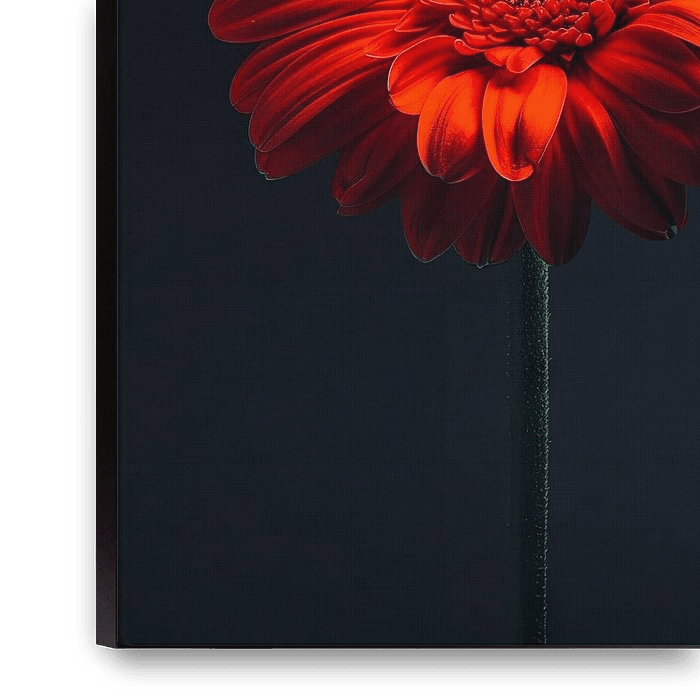 This artwork shows an impressive gerbera against a dark background. The contrast between the vibrant flower and the deep black creates a dramatic and captivating appearance. The intense colour tones and sharp detail of the petals give this art print an energetic presence, ideal for modern living and working spaces looking for expressive…