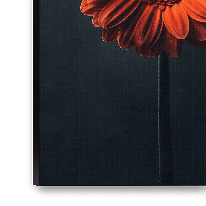 This artwork shows an impressive gerbera against a dark background. The contrast between the vibrant flower and the deep black creates a dramatic and captivating appearance. The intense colour tones and sharp detail of the petals give this art print an energetic presence, ideal for modern living and working spaces looking for expressive decoration. The simple yet strong composition will appeal to art lovers who appreciate minimalist designs with a striking colour palette.
