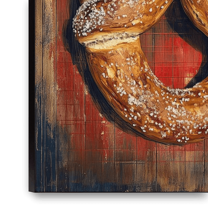 An artisanal pretzel on a dark red chequered wooden panel. The interplay between salt, shine and texture makes this print irresistible - perfect for kitchen, café or bakery.