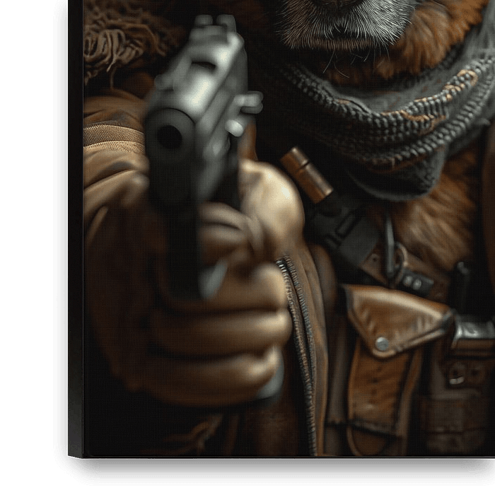 German shepherd with gun standing panorama painting that will be a unique addition to any room. With its beautiful and stylish look, it is a true eye-catcher. The brilliant colours and unusual design make this artwork 100% unique and original. It is the perfect photo print to complete your interior.