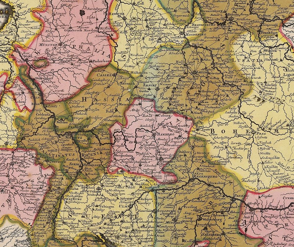 The Netherlands, Belgium, Luxembourg, Germany, Switzerland and Austria on a map. A large part of Europe and the Germanic provinces is shown on this map.