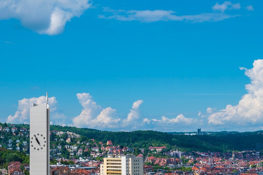 Germany, Aerial panorama view above stuttgart city houses and church, the skyline of the big city