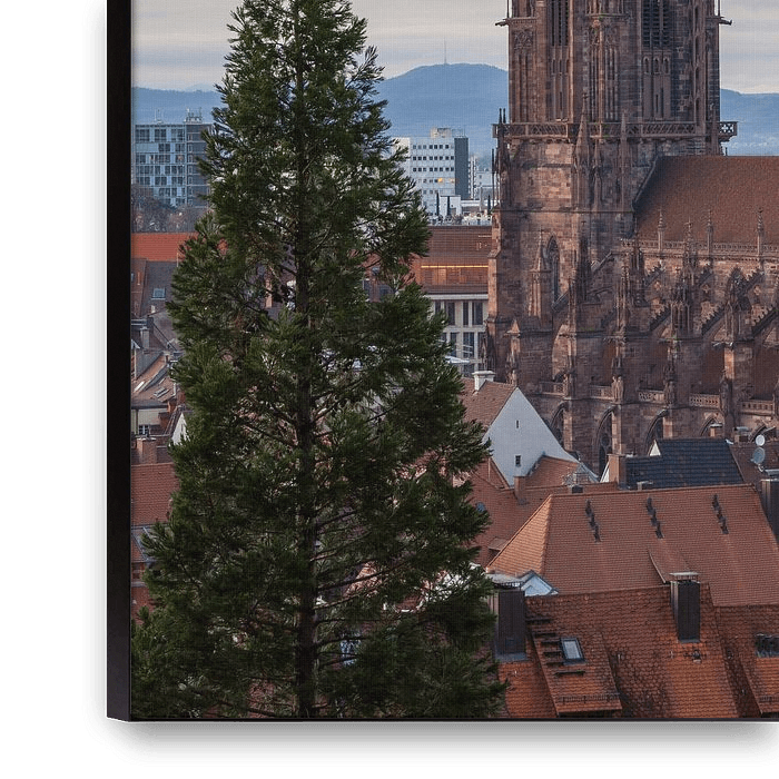 Buy the photo Germany, Ancient minster of Freiburg im Breisgau between trees by adventure-photos on canvas, ArtFrame, poster and wallpaper, printed on demand in high quality.