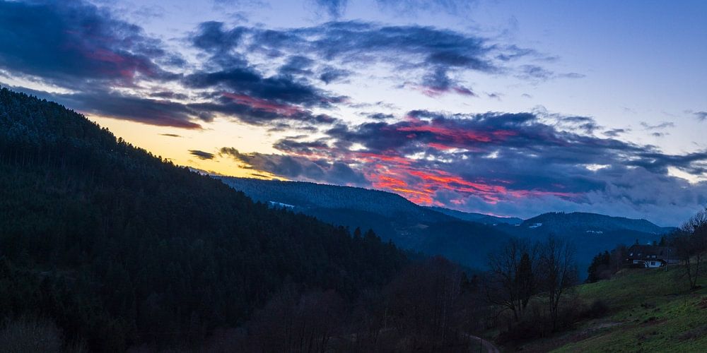 Germany, Beautiful burning sunset over snow covered trees in mountains of black forest extra large panorama