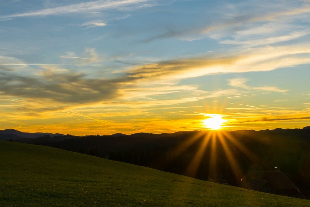 Germany, Warm romantic orange sunset light over nature landscape of black forest region