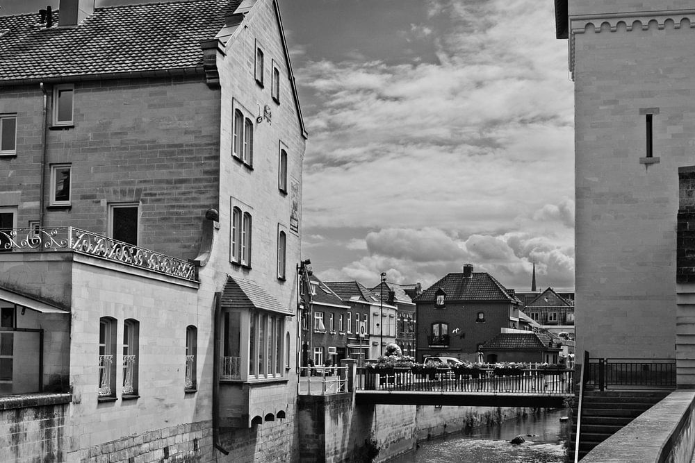 Black-and-white shot of Valkenburg town centre with the new Geulpoort, one of the 3 entrance gates in this small town built mainly of marl in southern Limburg (Netherlands).