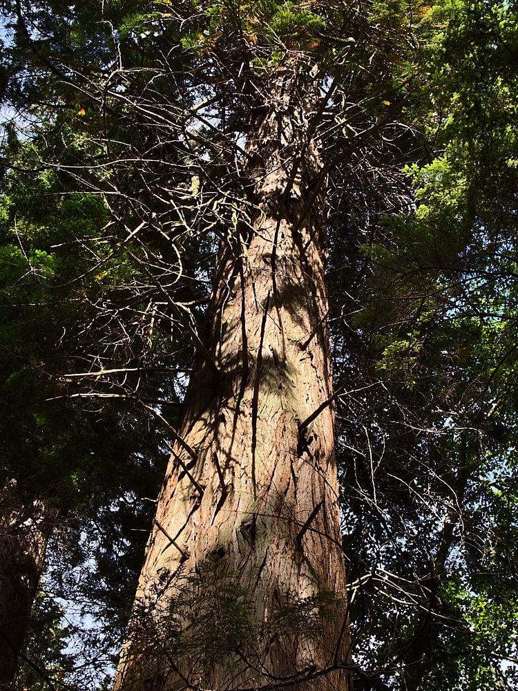 Photograph of an old, tall giant live tree (Thuja plicata, also giant thuja) with thick trunk and green canopy in a temperate rainforest on the Pacific coast in Lighthouse Park near West Vancouver, British Columbia, Canadan on a sunny day.