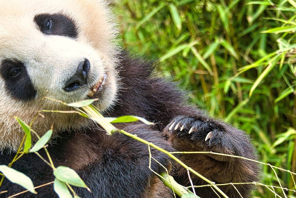 Giant panda eating bamboo. The endangered bear from Asia with black and white fur. Animal photo of a unique mammal.