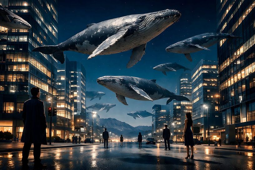 This breathtaking work of art transports the viewer into a surreal night scene in which giant whales float majestically above an illuminated city. The towering skyscrapers of the metropolis form an impressive backdrop for the floating giants of the sea, which are depicted with impressive detail and realistic texture. Down on the wet…