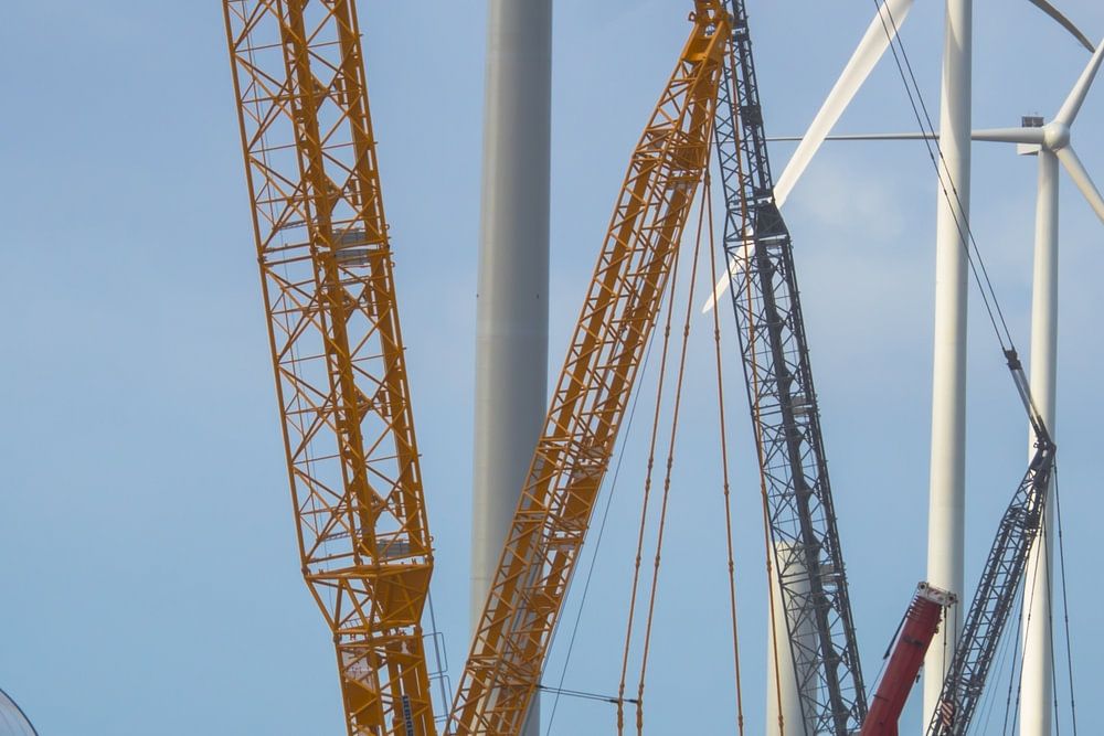 The picture shows one of the giants of the future: a huge wind turbine rising high into the sky. The turbine blades are the size of a sports field, and the towers reach for the sky. The scale of these machines is hard to imagine without the proper reference. That is why you can also see the imposing cranes needed to put these colossal structures in place. These cranes can carry hundreds of tonnes of lifting weight, making the construction of such gigantic wind turbines possible.