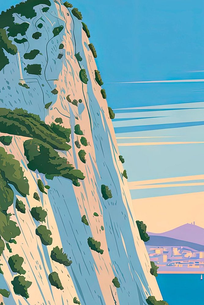 The Rock of Gibraltar rises majestically, surrounded by glittering blue that unites the sky and the sea. Gentle hills wind their way down to the coast, while the clear, light colour palette creates a peaceful atmosphere. The imposing cliffs are an invitation to explore and a reminder of the history of this unique place in the heart of the Mediterranean.