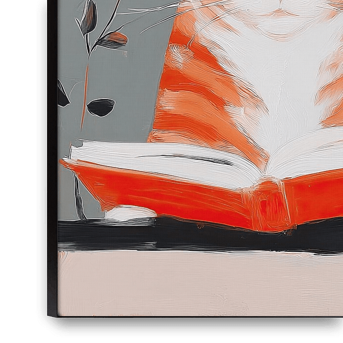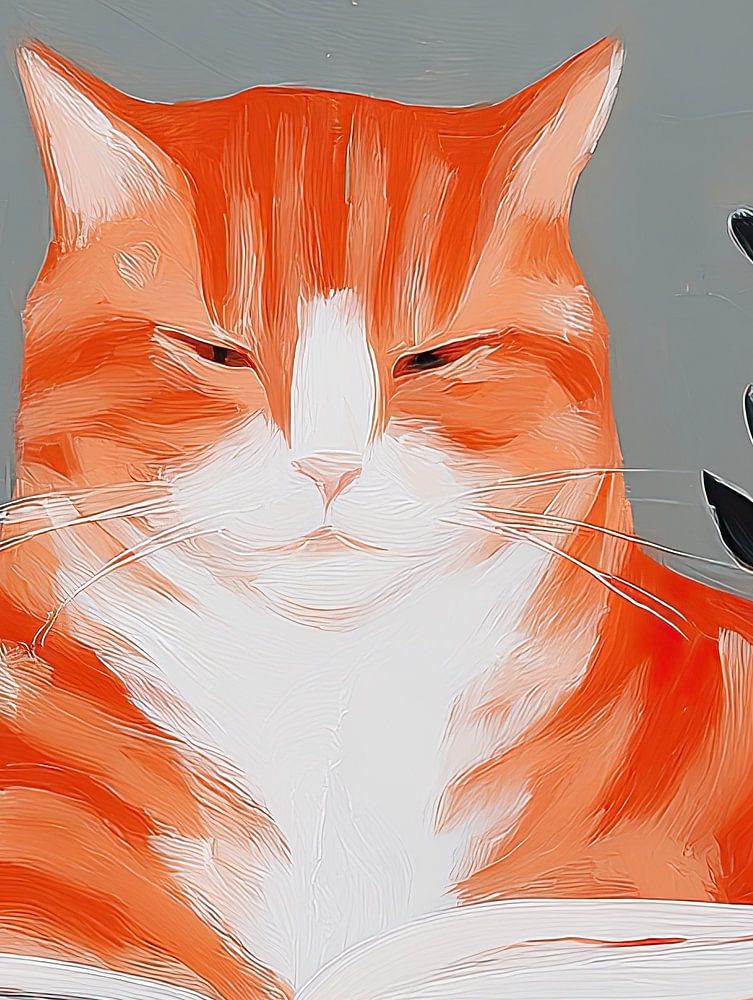 This artwork features a serene and cozy scene of a ginger cat peacefully reading an open book, set against a soft grey background accented with delicate botanical elements. Painted in a contemporary, expressive style, the illustration uses visible brushstrokes and gentle textures to create warmth and depth. The cat’s calm, almost…