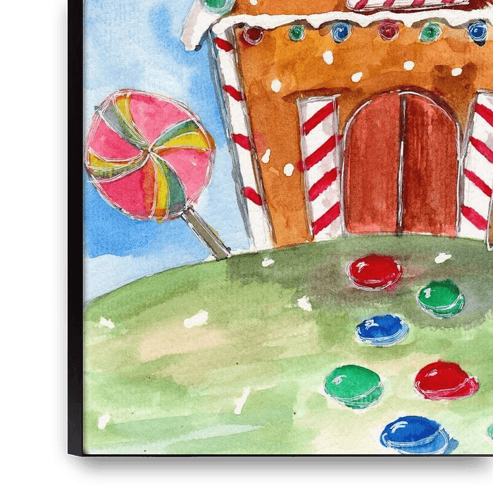 a colorful watercolor artwork of a colorful gingerbread house consisting of cookies and cakes with numerous candies, lollipops and chocolates as decorations.