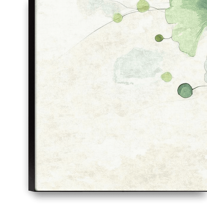 Delicate ginkgo leaves in soft shades of green, yellow and blue float above a light-flooded background. The fine lines and organic composition convey calm, balance and natural elegance.