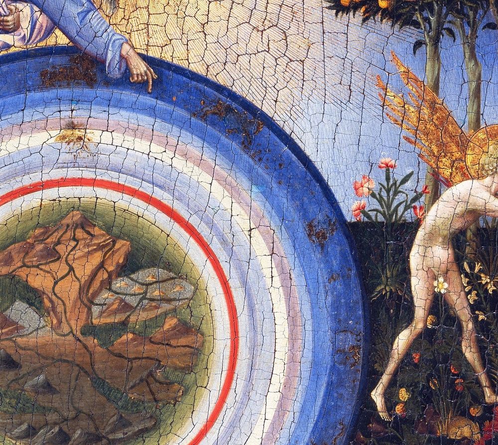 On the last day he created man, which after they were two were driven out of paradise. This is the right part of this late medieval/early Renaissance artwork. Here an angel leads Adam and Eve out of the garden.