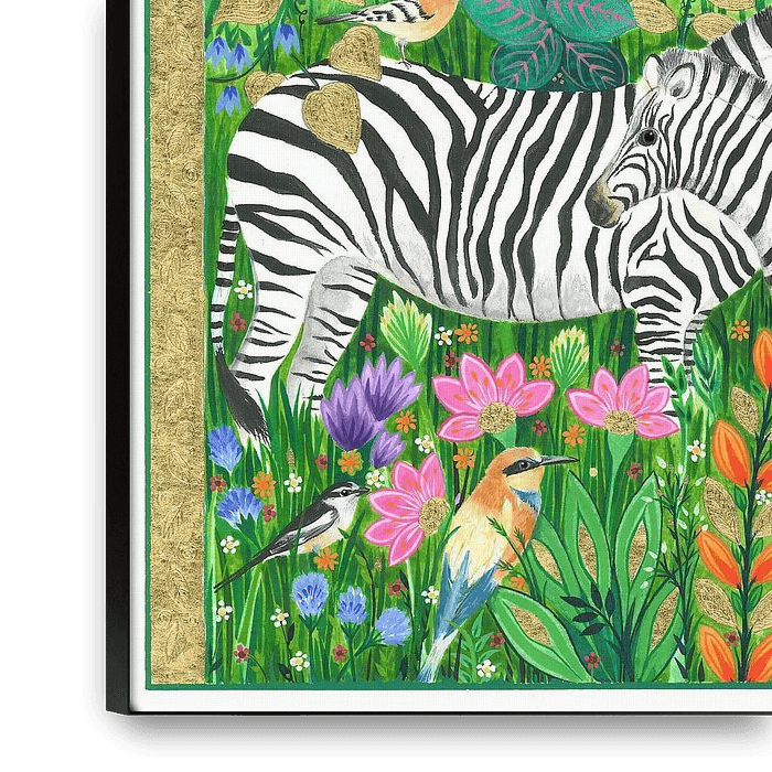 Giraffe and Zebras Amidst Vibrant Flora and Birds by Isabelle Brent