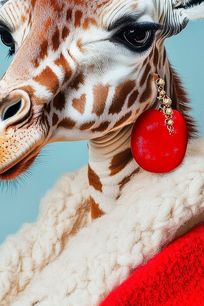 A fascinating portrait that combines style and humour: a giraffe in a chic red coat, adorned with eye-catching earrings. The combination of elegant fashion and animal charm invites a smile. Perfect for the living room, it brings a touch of extravagance and joy to any room.