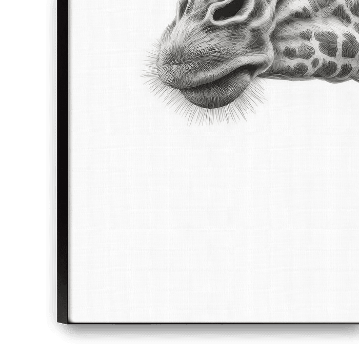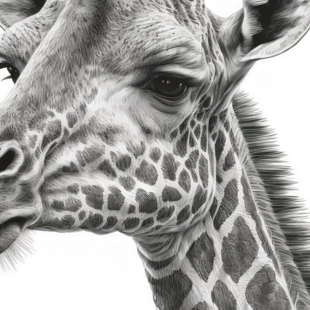 This poster features a portrait of a majestic giraffe holding its head high. The black and white drawing emphasises the giraffe's unique features, including its long neck and distinctive spots. The poster adds an elegant and sophisticated atmosphere to any room and will delight anyone who loves giraffes.