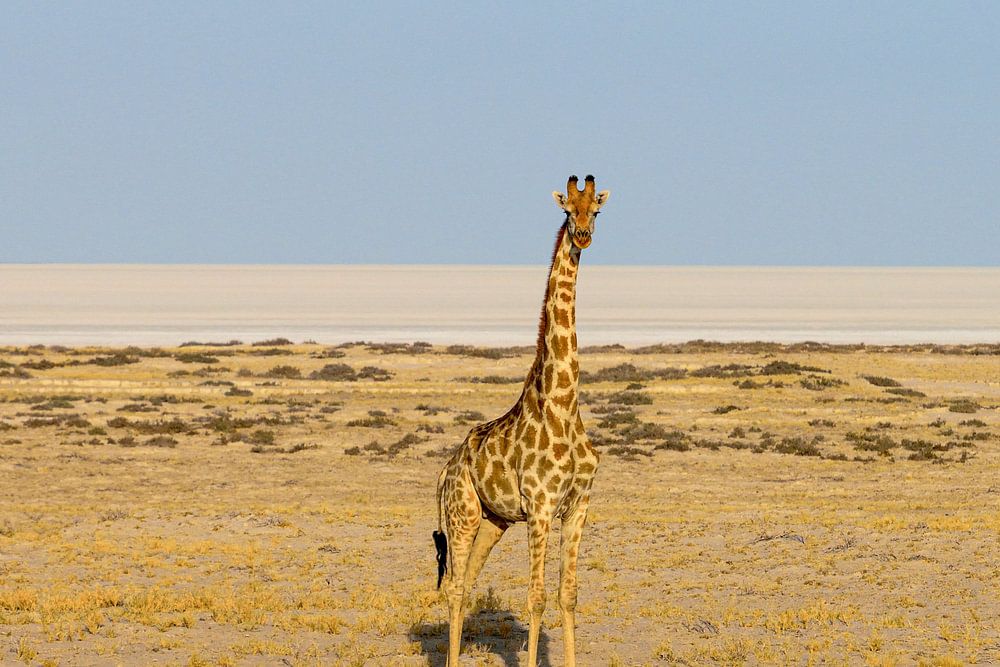 There's the Giraffe. In the middle of nowhere. What an extraordinary sight. Despite his height, he's still frightened. But when he gives you a kick, it can have big consequences, that's how much power there is behind it.
