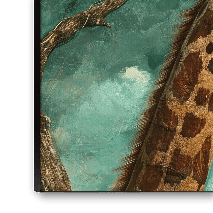 This artistic image shows a giraffe amidst a dreamy landscape, where the boundaries of reality and fantasy blur. The giraffe, with its distinctive long neck and spotted fur, seems to transform into a tree from which small birds spring, as if they are thoughts or dreams given free rein. The background is a soft fusion of turquoise and cream tones, with the rustic browns and golds of the giraffe and tree blending harmoniously into the surroundings. This image would fit perfectly in an interior that embraces natural elements and earthy tones, such as a bohemian living room, a rustic study room, or even a modern setting that plays with organic shapes and motifs.