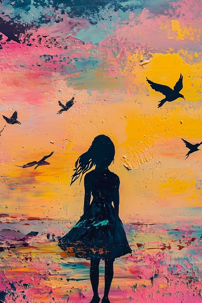 Be enchanted by this unique painting showing a silhouette of a girl against a vibrant, colourful sky full of birds. Perfect for adding a touch of emotion and creativity to your interior. The mix of expressive colours and dynamic brushstrokes creates a vibrant look. Ideal for modern living rooms, bedrooms or dining rooms, this artwork adds a touch of magic to any space.