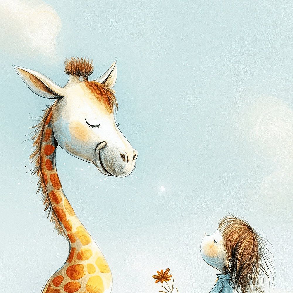 A beautiful illustration of a girl and a giraffe, perfect for brightening up the walls of a baby or nursery. This drawing has been created with care, appearing to use soft water colours and calm colour palettes to create a soothing atmosphere.