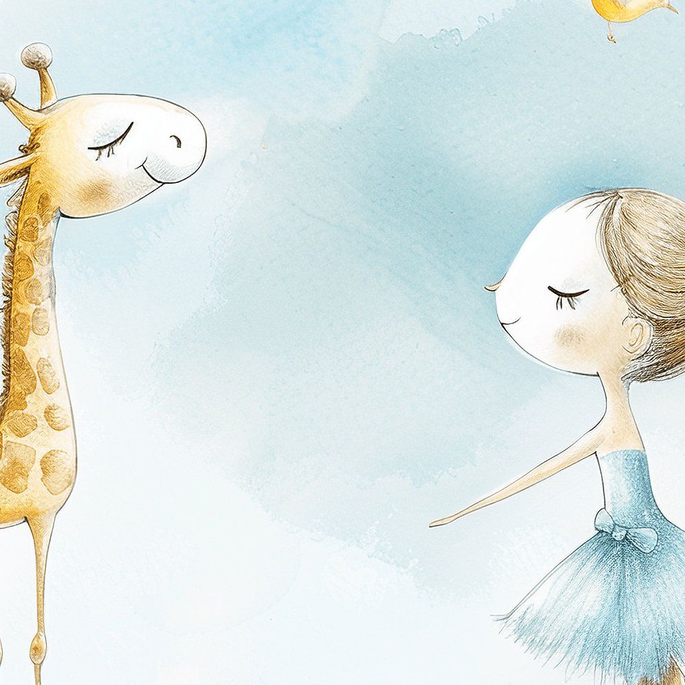 A beautiful illustration of a ballarina and a giraffe, perfect for brightening up the walls of a baby or nursery. This drawing has been created with care, appearing to use soft water colours and calm colour palettes to create a soothing atmosphere.