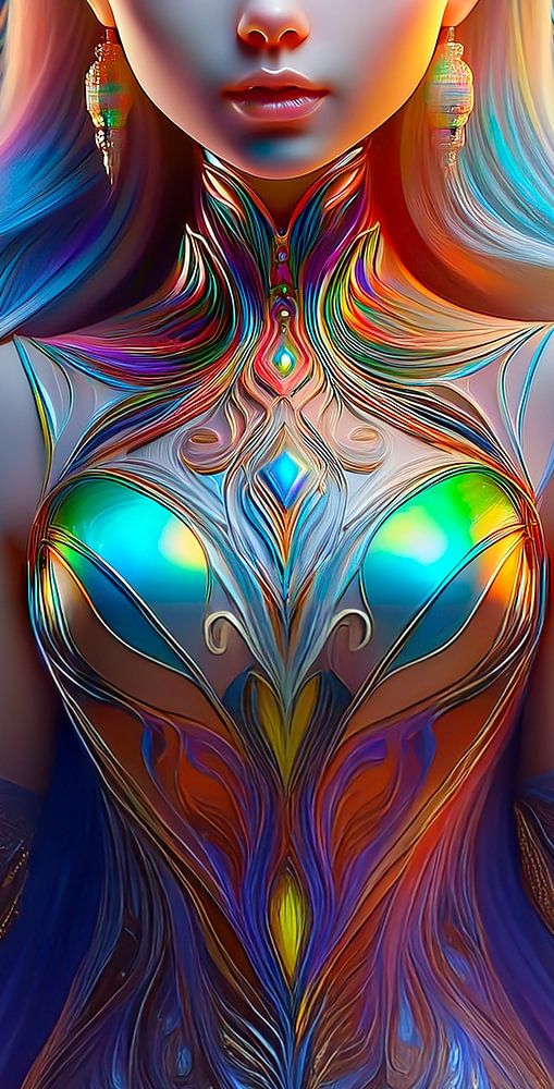 A beautiful girl, looking like an angel, radiates light in all kinds of colours. She seems to be floating in the universe and just radiates a positive atmosphere. The image was generated using ai.