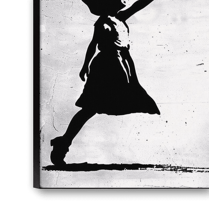 This artwork depicts a powerful image of a girl releasing a red heart-shaped balloon. The combination of the black silhouette against the white background with the striking red heart creates a strong contrast, giving the work an emotional charge. Evoking feelings of loss, hope and freedom, the image captures the imagination of adults and children alike. Perfect for modern décor, this artwork brings a piece of street art into your home and adds a touch of contemporary style to any space.