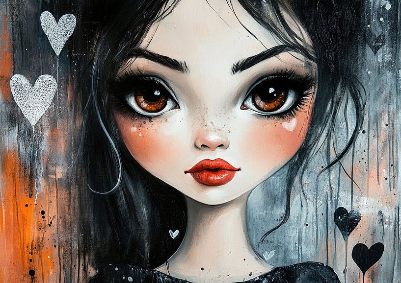Details: women's painting, portrait painting, modern, girls, large eyes, hearts, black, white, red, playful Colours: black, white, red, orange, brown Girl…