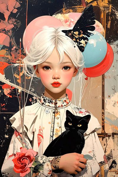 An illustration of a beautiful girl, holding a black cat in her arms, in a colourful retro style. The girl has striking white hair and big eyes. The whole thing is done in pop art style and a surrealistic style. The abstract background and coloured balloons give the whole image a festive look. The image was generated using ai.