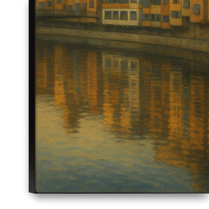 Buy this landscape artwork Girona Sunset Reflections – Houses Along the Onyar River by Travel Shop on canvas, ArtFrame, poster and wallpaper, printed on demand in high quality.