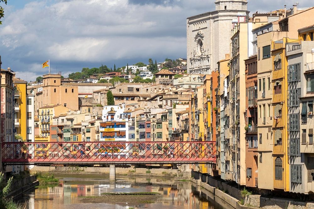Panorama of the colourful houses in Girona. The houses are located along the Rio Onyar and can be viewed beautifully on one of the many bridges over the river.