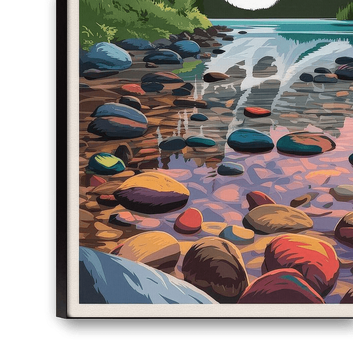 A harmonious scene that captures the majestic mountains and the clear water of a glistening mountain lake. Warm light dances across the colourful stones in the foreground, bringing the impressive landscape to life. This artistic depiction brings a piece of nature directly into your living room and is perfect for a relaxing retreat.