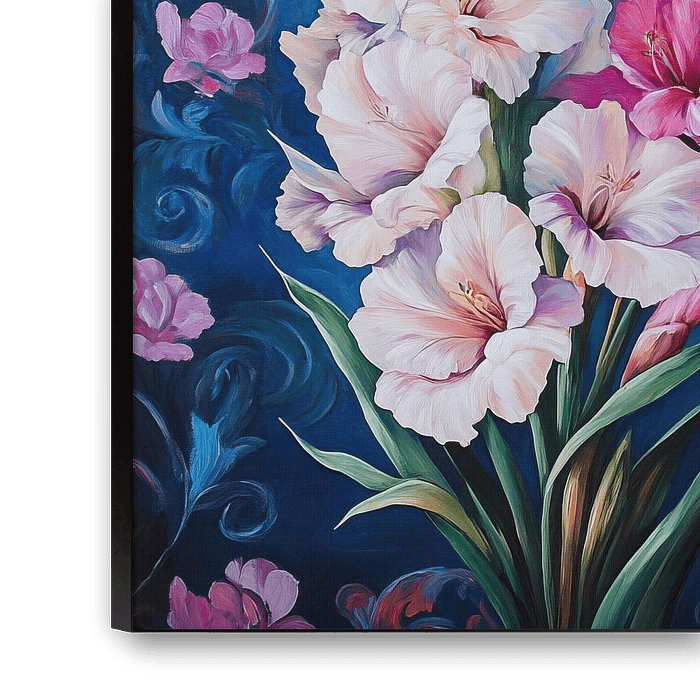 Gladioli | White and Pink Flowers - This flower painting shows a vibrant collection of gladioli in shades of pink and white, with dainty leaves and subtle, dark background embellishments that bring out the flowers.