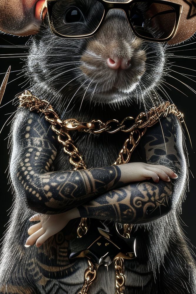 This mouse knows what fashion is. With his gold accessories, sleek tattoos and glasses as confident as his pose, he is the epitome of character and style. The black background enhances the luxurious feel and makes every detail stand out.